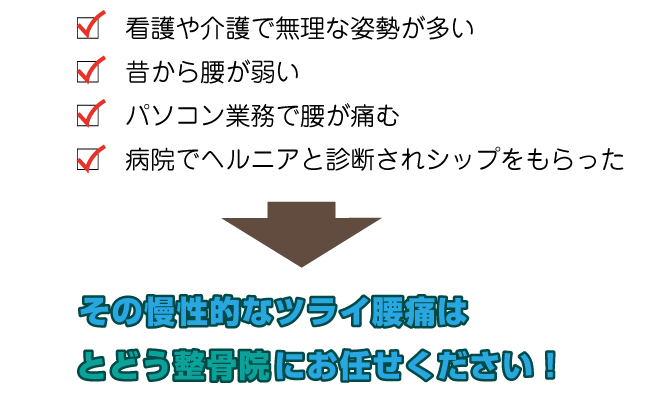 京都府宇治市菟道のとどう整骨院ではその根本的な原因@=痛いところだけでなく腰痛に関連する筋肉の血行促進と原因A=背骨と骨盤のズレも治療し、すべての根本を取り除き「腰痛」という症状を改善させます。